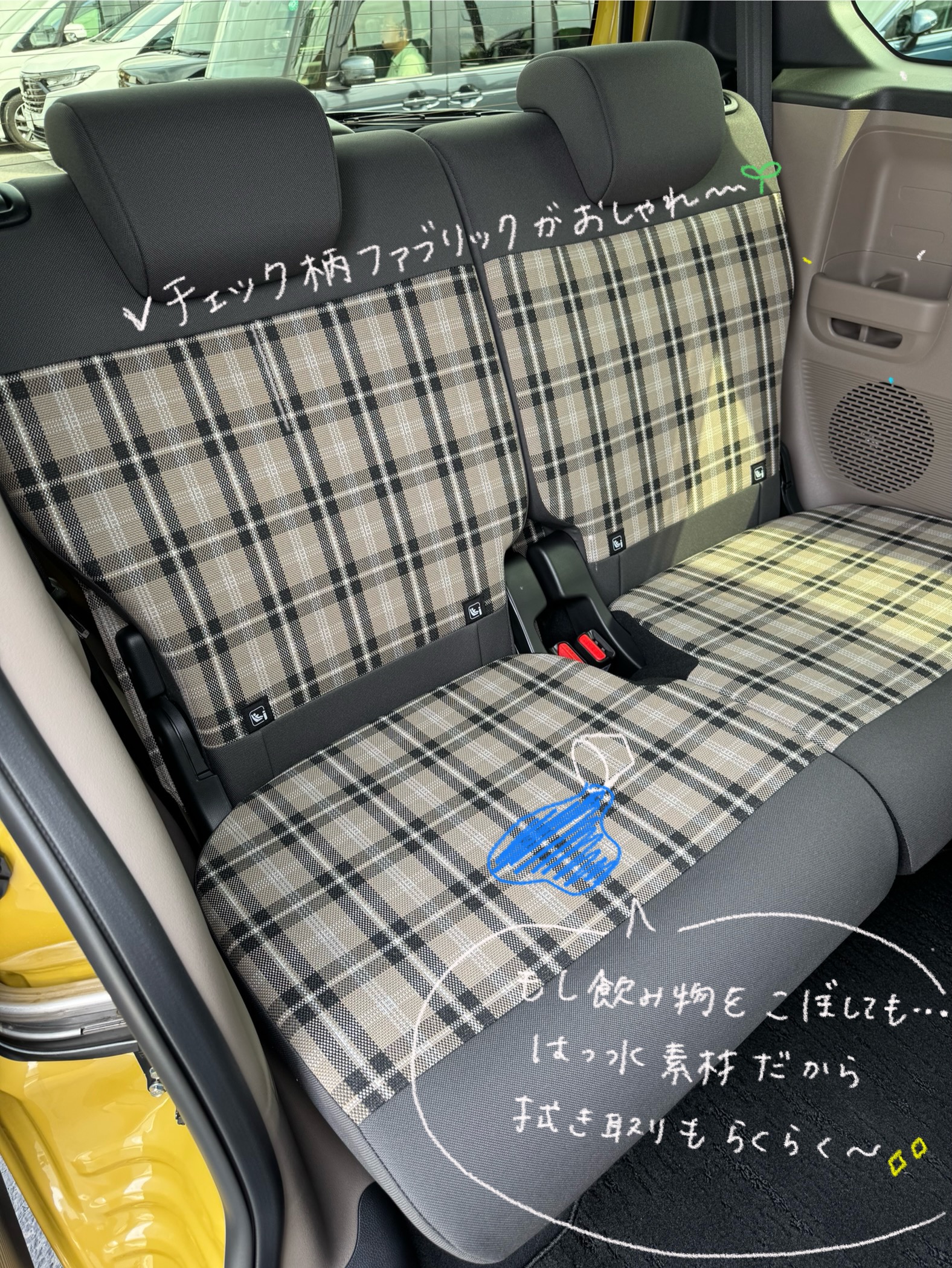 汚れが目立ちにくいチェック柄の撥水シートを採用💧