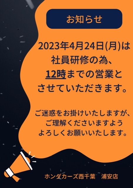 誠に勝手ながら4月24日(月)は全社員研修のため営業時間がお昼の12時までとなっております。