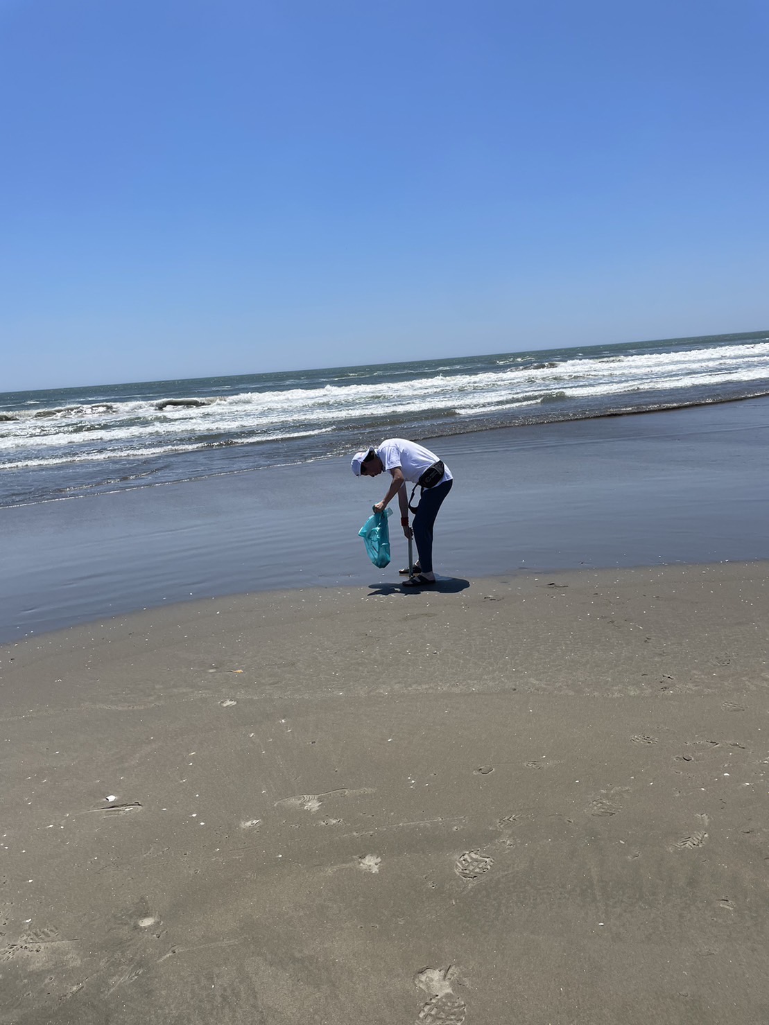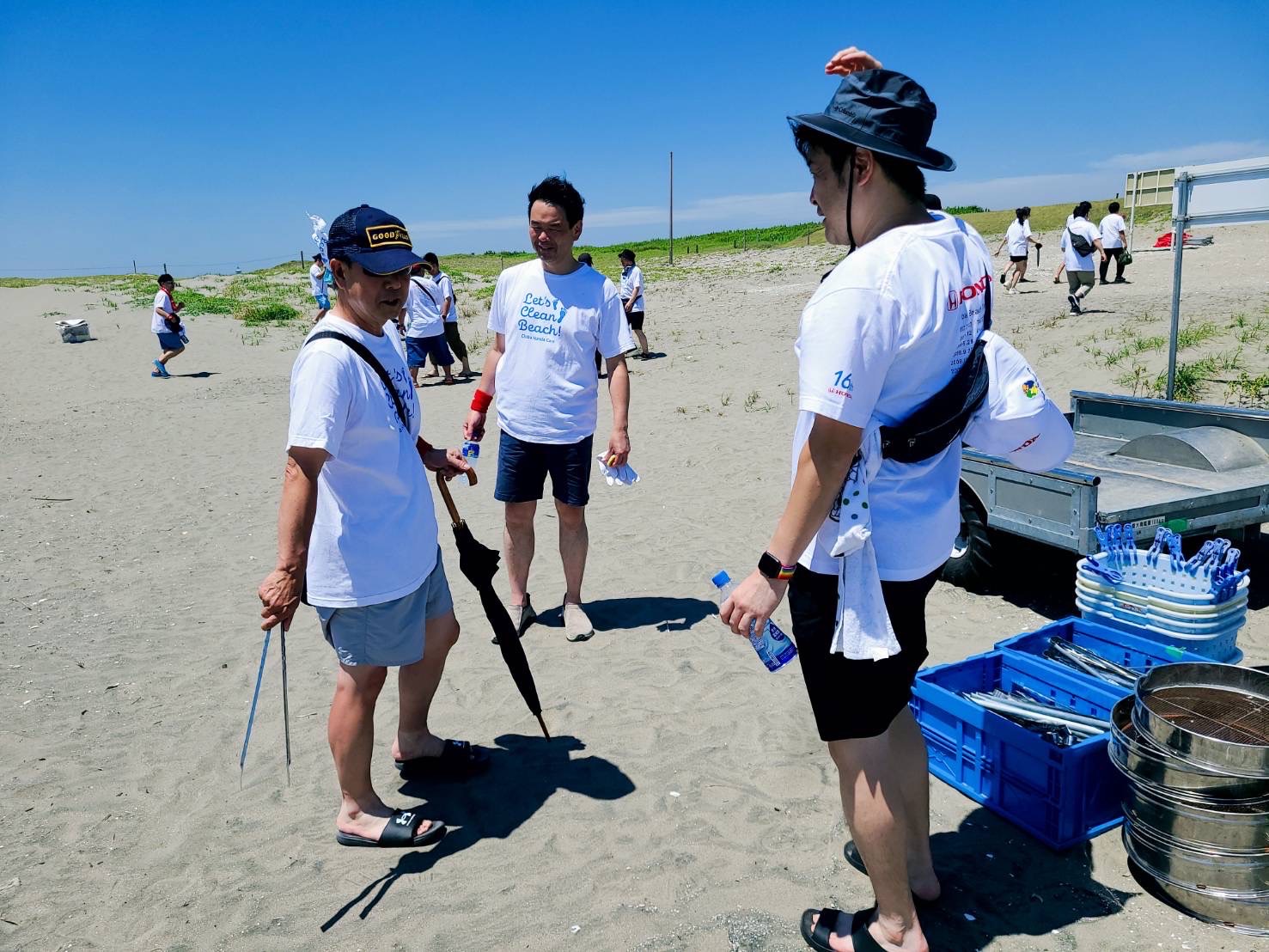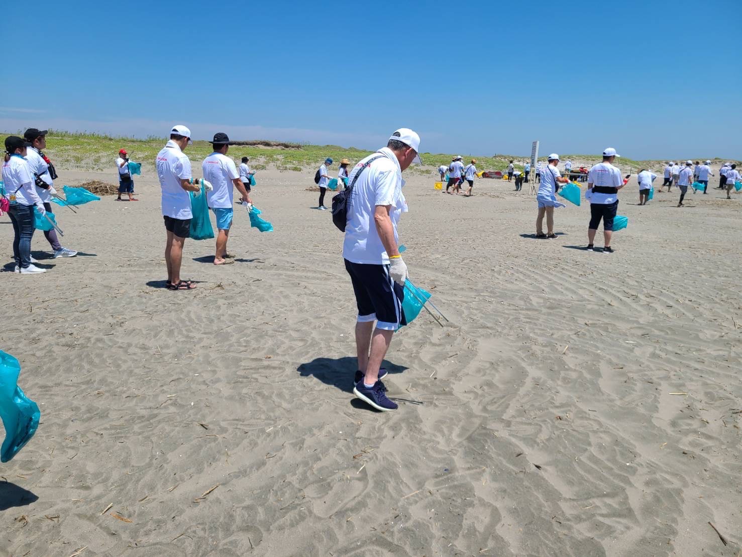 全員お揃いのTシャツを着て海岸のゴミを手で拾って集め、