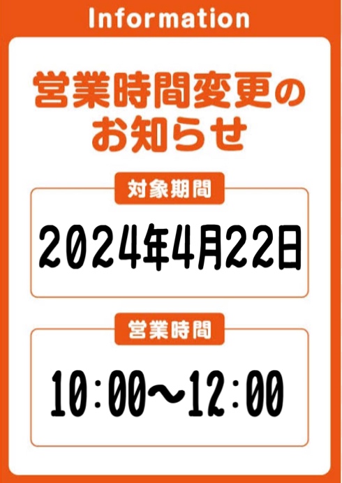 4月22日(月)営業時間変更のお知らせ