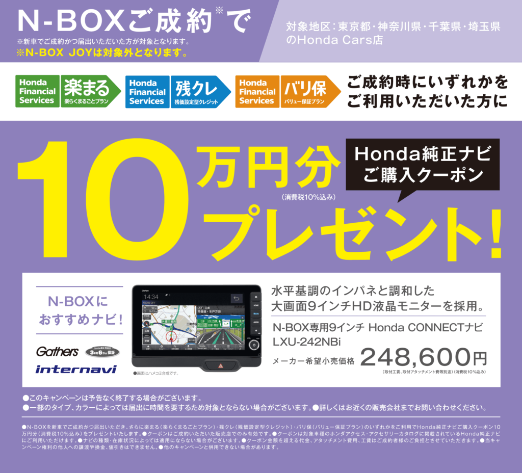 キャンペーン TOP > キャンペーン > N-BOXご成約で10万円ナビクーポンプレゼント 2024/10/01 N-BOXご成約で10万円ナビクーポンプレゼント N-BOXをご検討中の方にNEWSです! 今ならご成約時に楽まる・残クレ・バリ保のいずれかをご利用いただくと、 \Honda純正ナビご購入クーポンを10万円分プレゼント!/ \この機会に是非N-BOXをご検討ください!/