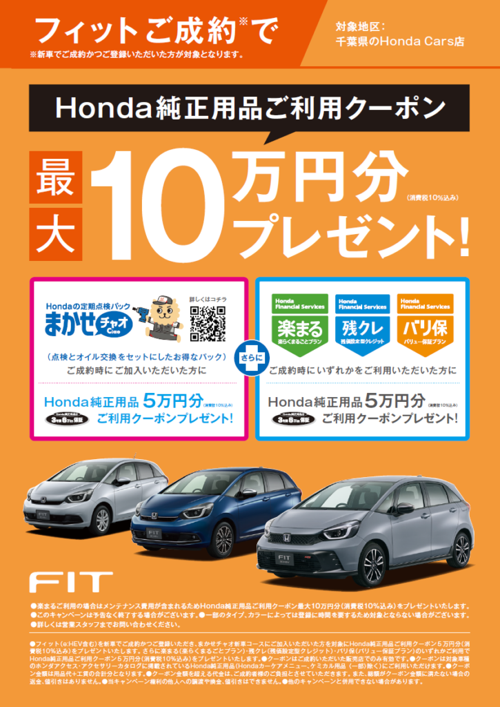 FITご成約時にまかせチャオご加入でHonda純正用品ご利用クーポン5万円分プレゼント!