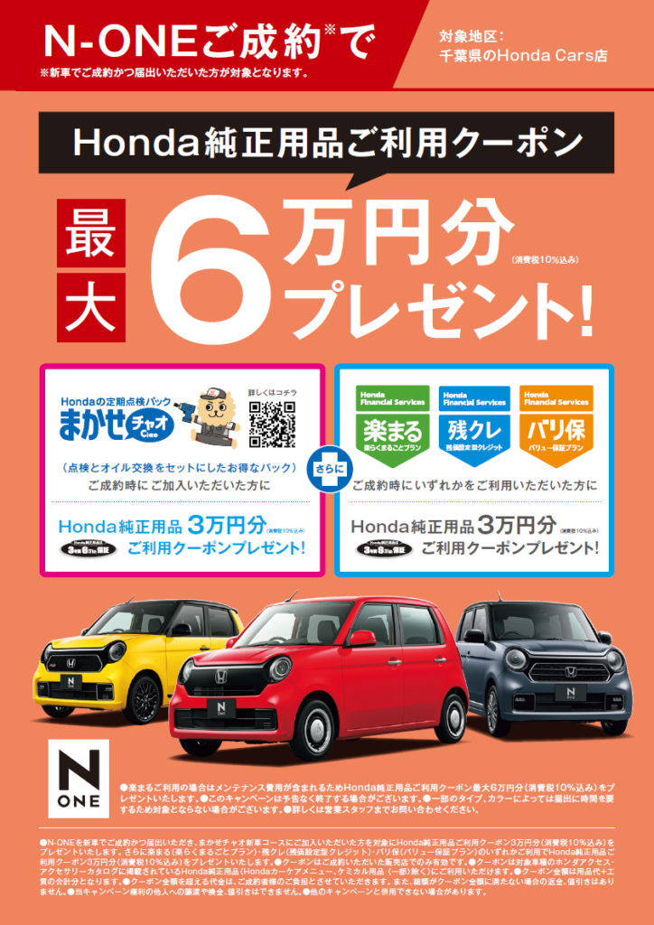●詳しくは営業スタッフまでお問い合わせください。●N-ONEを新車でご成約かつ届出いただき、まかせチャオ新車コースにご加入いただいた方を対象にHonda純正用品ご利用クーポン3万円分(消費税10%込み)をプレゼントいたします。さらに楽まる(楽らくまるごとプラン)・残クレ(残価設定型クレジット)・バリ保(バリュー保証プラン)のいずれかご利用でHonda純正用品ご利用クーポン3万円分(消費税10%込み)をプレゼントいたします。●クーポンはご成約いただいた販売店でのみ有効で