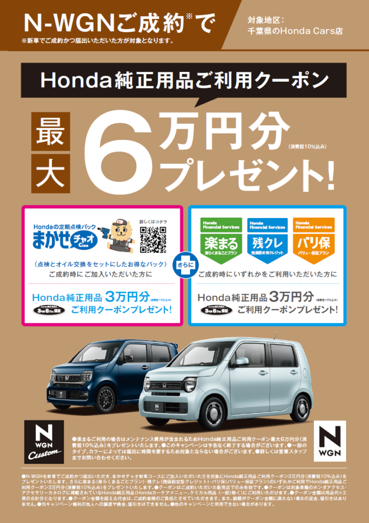 ●詳しくは営業スタッフまでお問い合わせください。●N-WGNを新車でご成約かつ届出いただき、まかせチャオ新車コースにご加入いただいた方を対象にHonda純正用品ご利用クーポン3万円分(消費税10%込み)をプレゼントいたします。さらに楽まる(楽らくまるごとプラン)・残クレ(残価設定型クレジット)・バリ保(バリュー保証プラン)のいずれかご利用でHonda純正用品ご利用クーポン3万円分(消費税10%込み)をプレゼントいたします。●クーポンはご成約いただいた販売店でのみ有効で