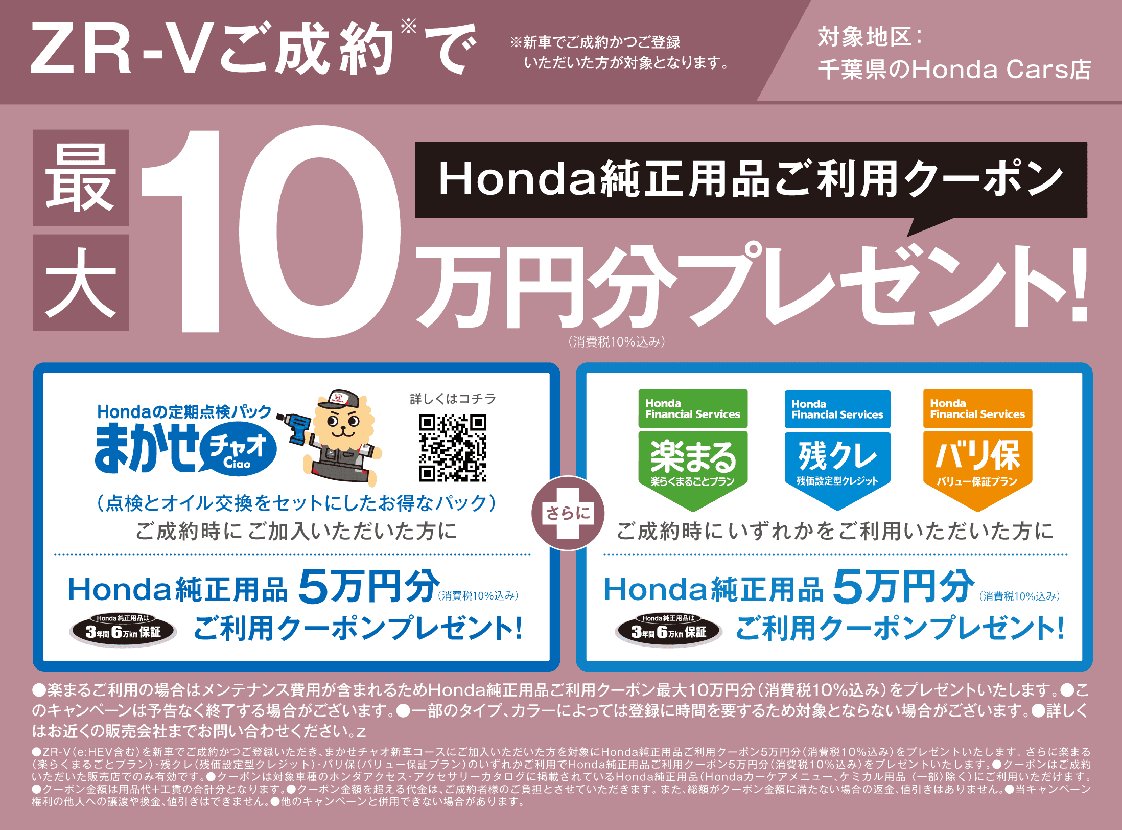 キャンペーン TOP > キャンペーン > ZR-Vご成約で最大10万円!用品クーポンプレゼント 2024/08/01 ZR-Vご成約で最大10万円!用品クーポンプレゼント ZR-Vをご検討中の方にNEWSです! ZR-Vご成約時にまかせチャオご加入で Honda純正用品ご利用クーポン5万円分プレゼント! また、ご成約時に【楽まる】【残クレ】【バリ保】いずれかのご利用でさらに Honda純正用品ご利用クーポン5万円分がついてきます! ★★最大10万円分のお得なクーポン★★ 自分だけのZR-Vをカスタマイズしましょう★ この機会に是非ZR-Vをご検討ください!