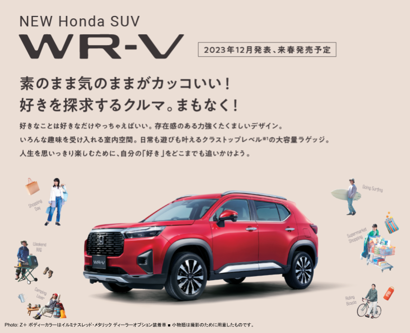 ニュース TOP > ニュース > New Honda SUV WR-V 先行予約開始! 2023/11/17 New Honda SUV WR-V 先行予約開始! NEW Honda SUV WR-V 先行予約開始! 来春発売予定のHondaの 新しいSUV 「WR-V」ご期待ください! ご相談は お近くの店舗まで!! 先行情報サイトはコチラ!