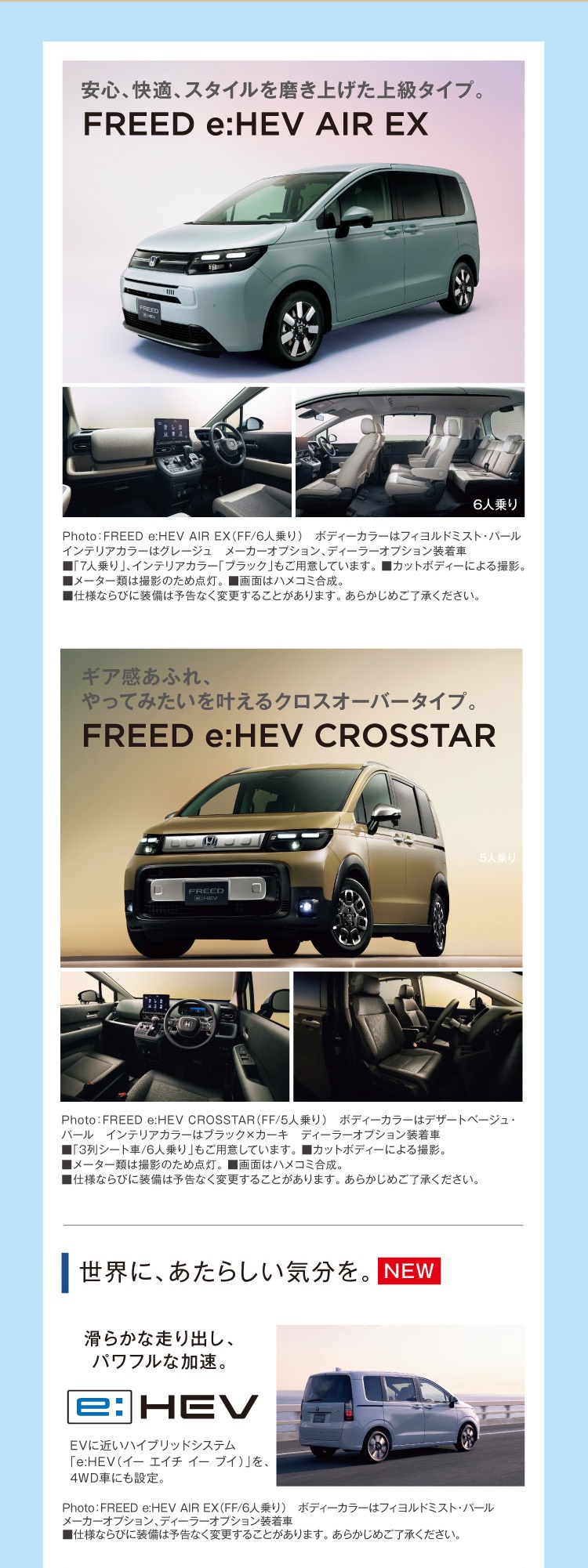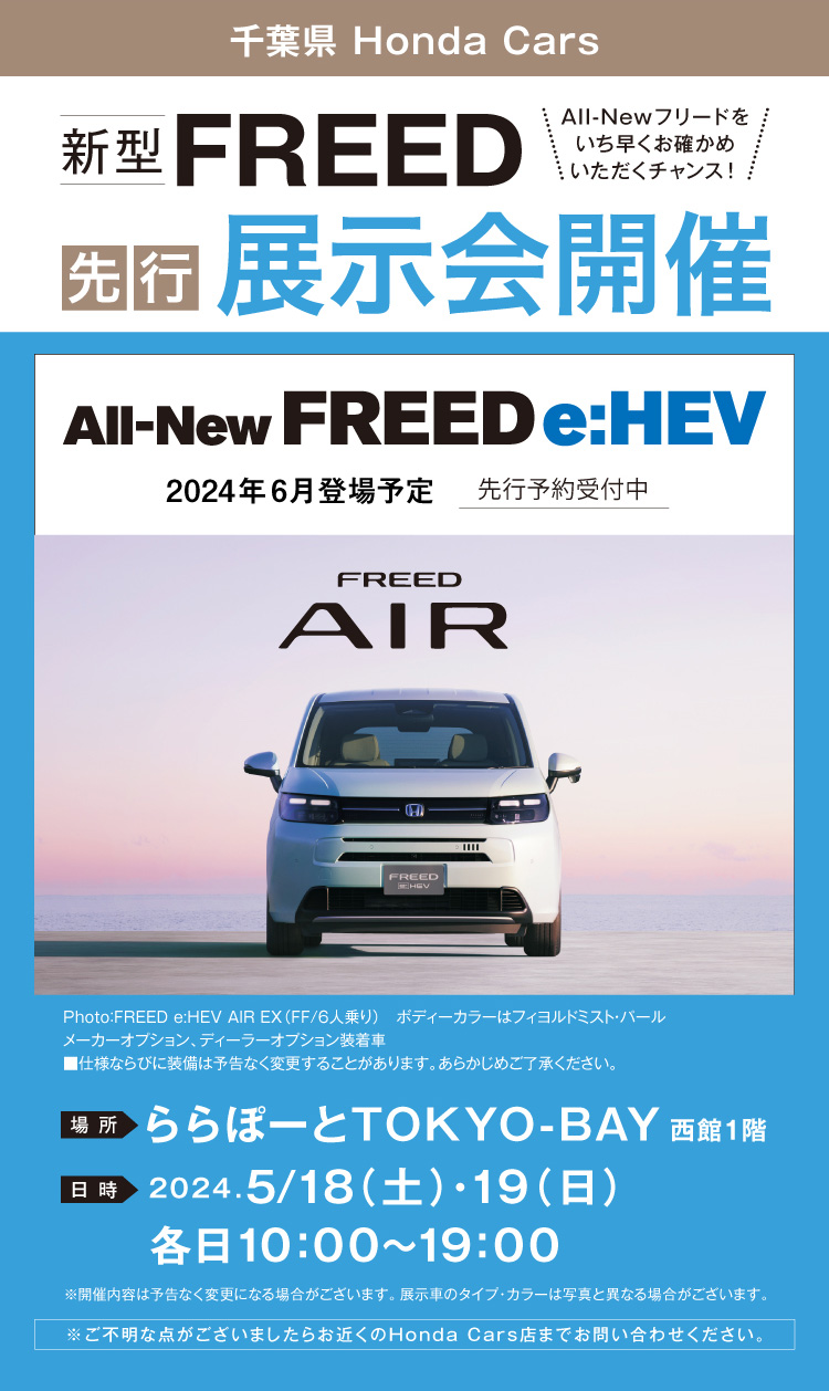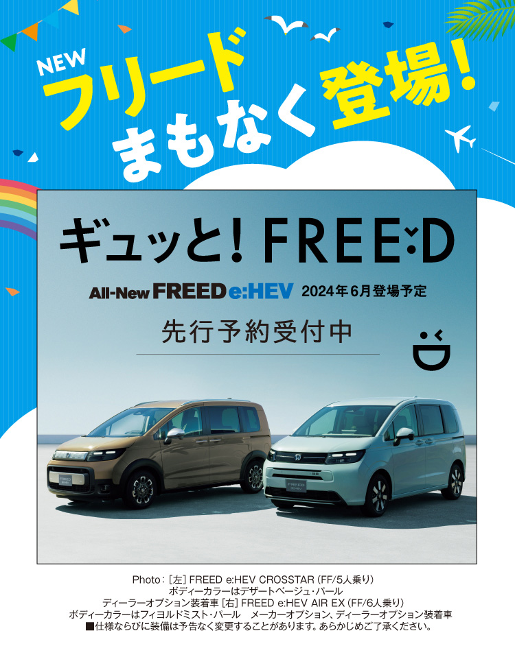 ニュース TOP > ニュース > All-New FREED 先行予約受付中 2024/05/09 All-New FREED 先行予約受付中 All-New FREED について さらに詳しい情報は メーカー先行情報サイトを お確かめください。 お出かけの準備もこの機会にぜひ!