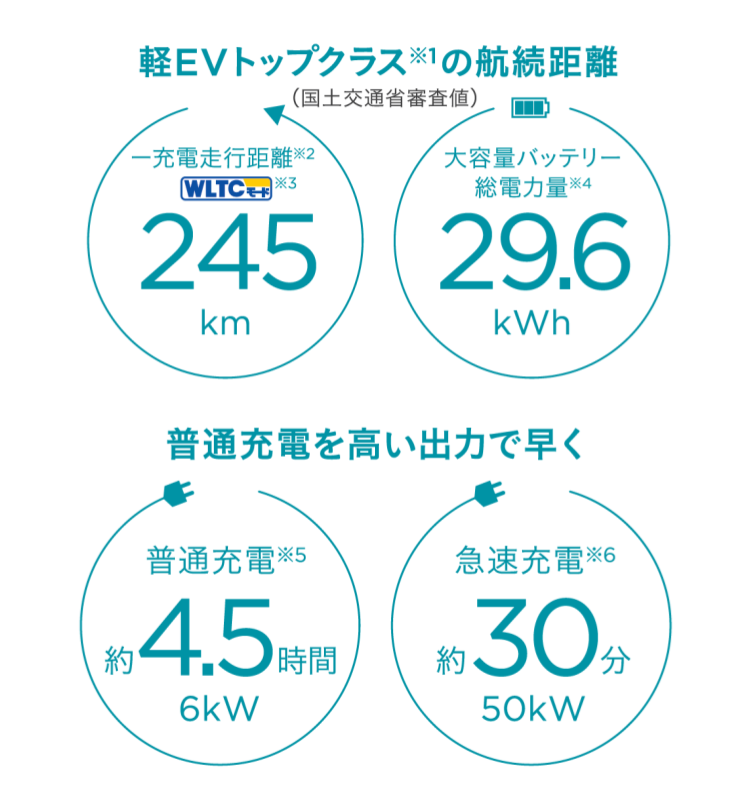 ※2:一充電走行距離は定められた試験条件での値です。お客様の使用環境(気象、渋滞等)や運転方法(急発進、エアコン使用等)に応じて一充電走行距離は大きく異なります。 ※3:WLTCモード:市街地、郊外、高速道路の各走行モードを平均的な使用時間配分で構成した国際的な走行モード。 ※4:総電力量は、車両に搭載した電池のエネルギー量を表しています。国連危険物輸送勧告の定義に基づき算出した値であり、電圧(V)と容量(Ah)、セル数によって求められます。 ※5:普通充電は、充電残量警告灯が点灯した時点から、満充電までのおおよその時間。 ※6:急速充電は、充電残量警告灯が点灯した時点から、充電量80%までのおおよその時間(特に、夏季・冬季には充電時間が長くなる場合があります)。 ■充電器の仕様、周辺の環境温度、バッテリーの残量によって充電時間や充電可能容量が異なる場合があります。 ■e:L4の急速充電はメーカーオプションとなります。 ■ご自宅や事業所などで充電する場合、充電設備が必要となります。![]()